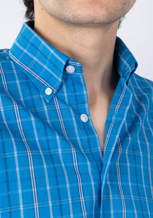 Crisp Mid Blue Oxford Pinpoint Double Button Collar Shirt - Wrinkle Resistant