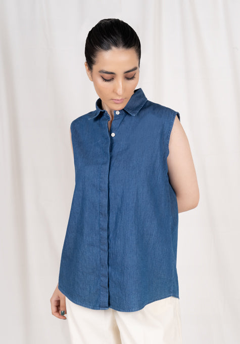 SUMMER DENIM DARK WASH SLEEVELESS SHIRT