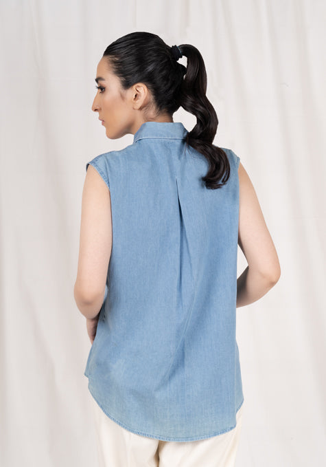 SUMMER DENIM LIGHT WASH SLEEVELESS SHIRT