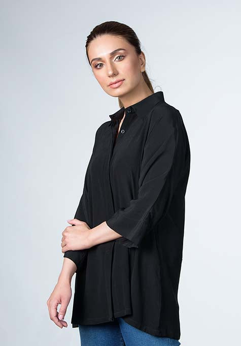 BLACK SILK CHARMEUSE SHIRT (WRINKLE RESISTANT)