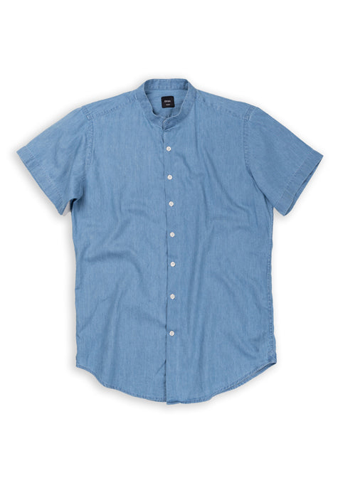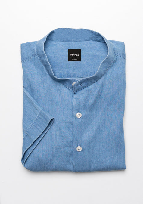 SUMMER DENIM LIGHT WASH SHIRT - HALF SLEEVES BAND COLLAR